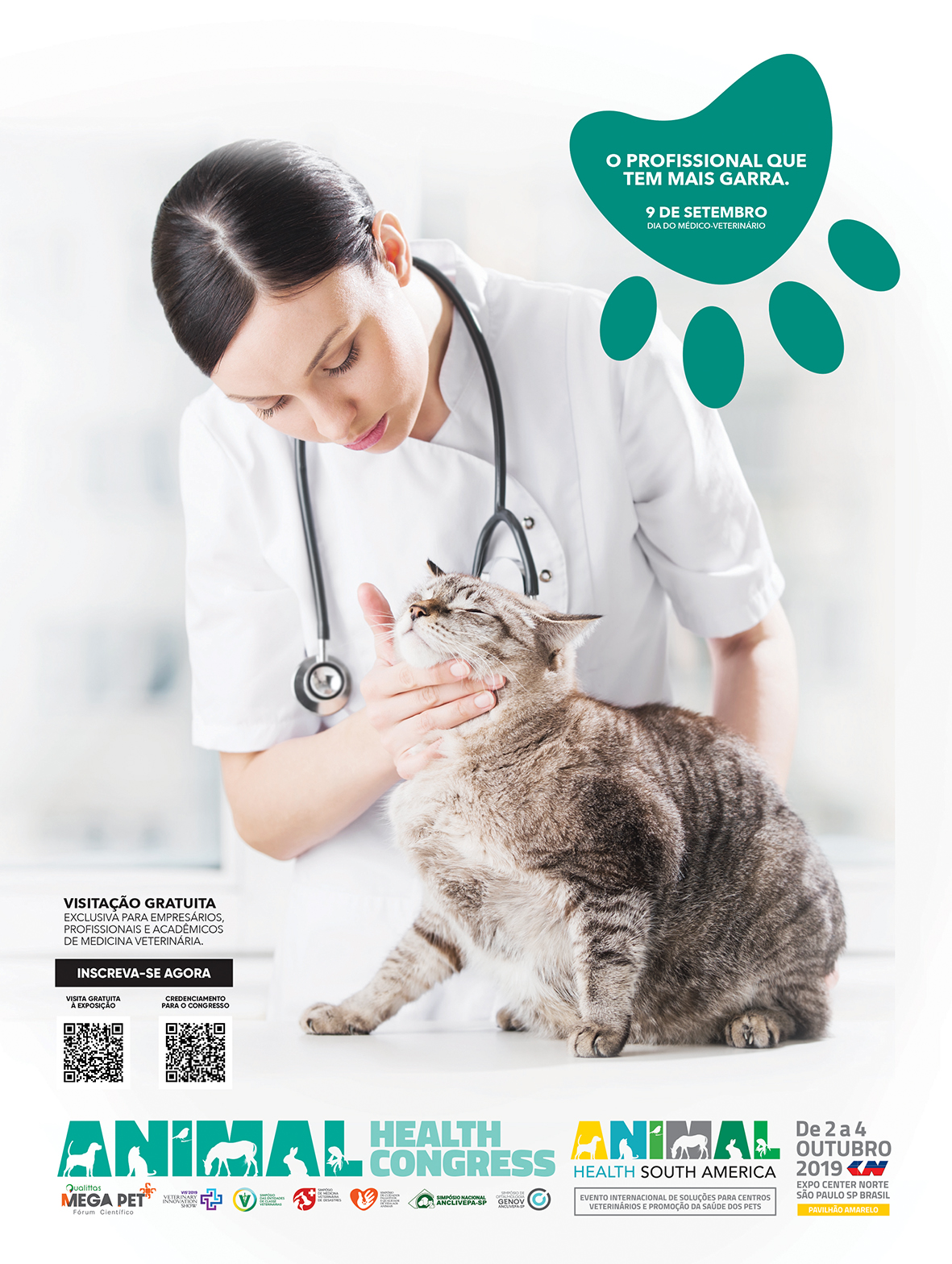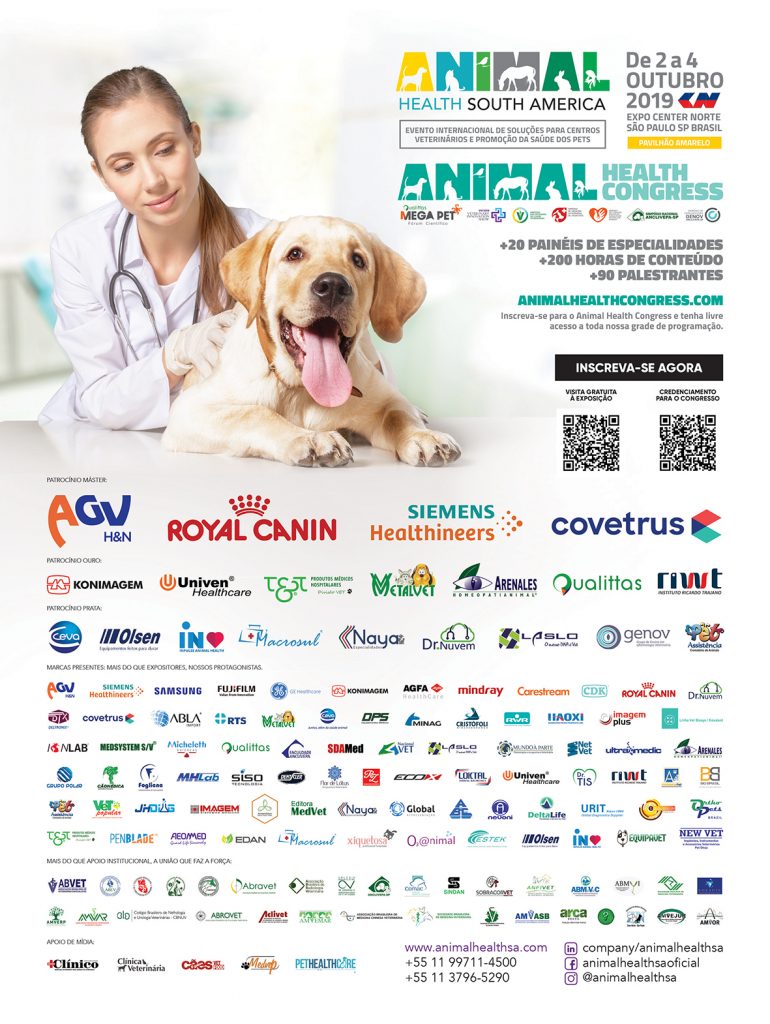 Entre os dias 2 a 4 de outubro de 2019, será realizado o Animal Health Congress, a promogração de conteúdo técnico científico e educação continuada da Animal Health South America 2019, que contempla acesso total ao Mega Pet Fórum Científico Internacional de Especialidades (15 países de especialidades veterinárias), o Simpósio Nacional da Anclivepa – SP de Especialidades Veterinárias, ao VIS – Veterinary innovation Show (Fórum Internacional de Gestão) e a importantes outros eventos satélites realizados por entidades de classes, empresas e profissionais. Estamos estruturando um evento focado na prática clínica cotidiana, buscando prover informações úteis para o dia a dia, como discussões de casos clínicos, avanços tecnológicos, cases, sessões interativas entre especialidades e melhores práticas ministradas por experts, uma programação multidisciplinar criada e ministrada pelos melhores profissionais do mercado nacional e internacional. Também ofereceremos aos pesquisadores e estudantes, amplo espaço para a apresentação de pôsteres.