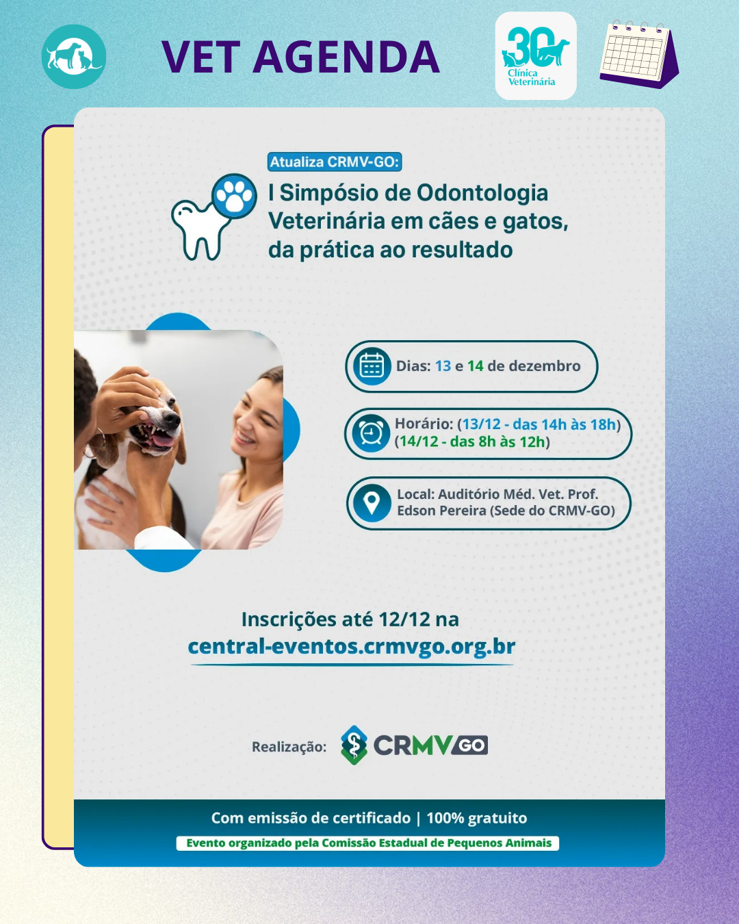 🗓️ Nos dia 13/12, das 14h às 18h, e no dia 14/12, das 8h às 12h, acontecerá no auditório Médico-Veterinário Professor Edson Pereira na sede do CRMV-GO o evento «Atualiza CRMV-GO: I Simpósio de Odontologia Veterinária em cães e gatos, da prática ao resultado».
