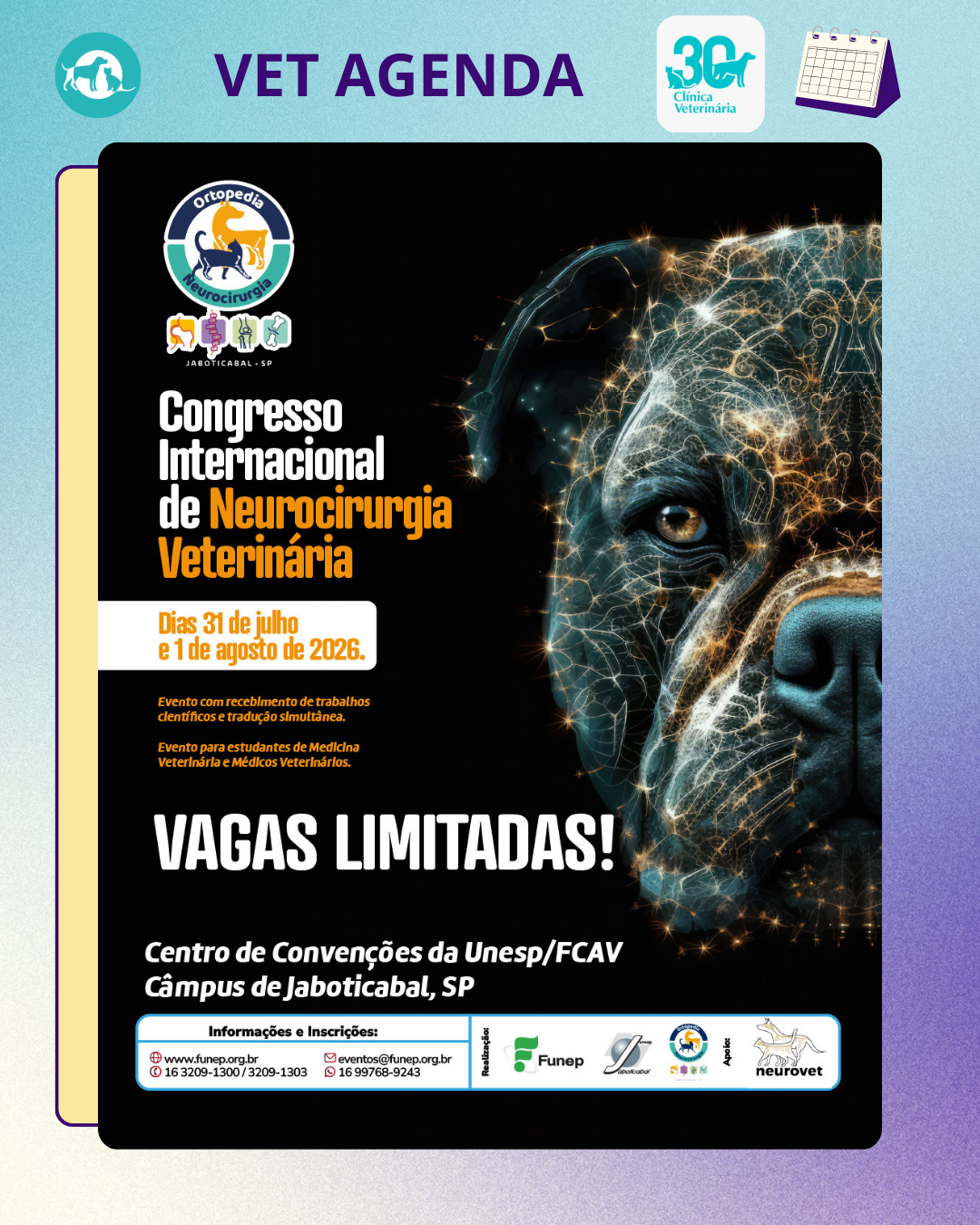 🧠🐶 Participe do Congresso Internacional de Neurocirurgia Veterinária! Uma oportunidade única para se atualizar sobre os avanços na área, trocar experiências com grandes nomes da neurocirurgia veterinária e aprimorar suas técnicas clínicas e cirúrgicas. Um encontro imperdível para quem busca excelência no atendimento neurológico de pequenos animais.