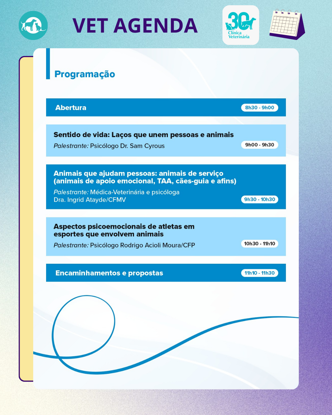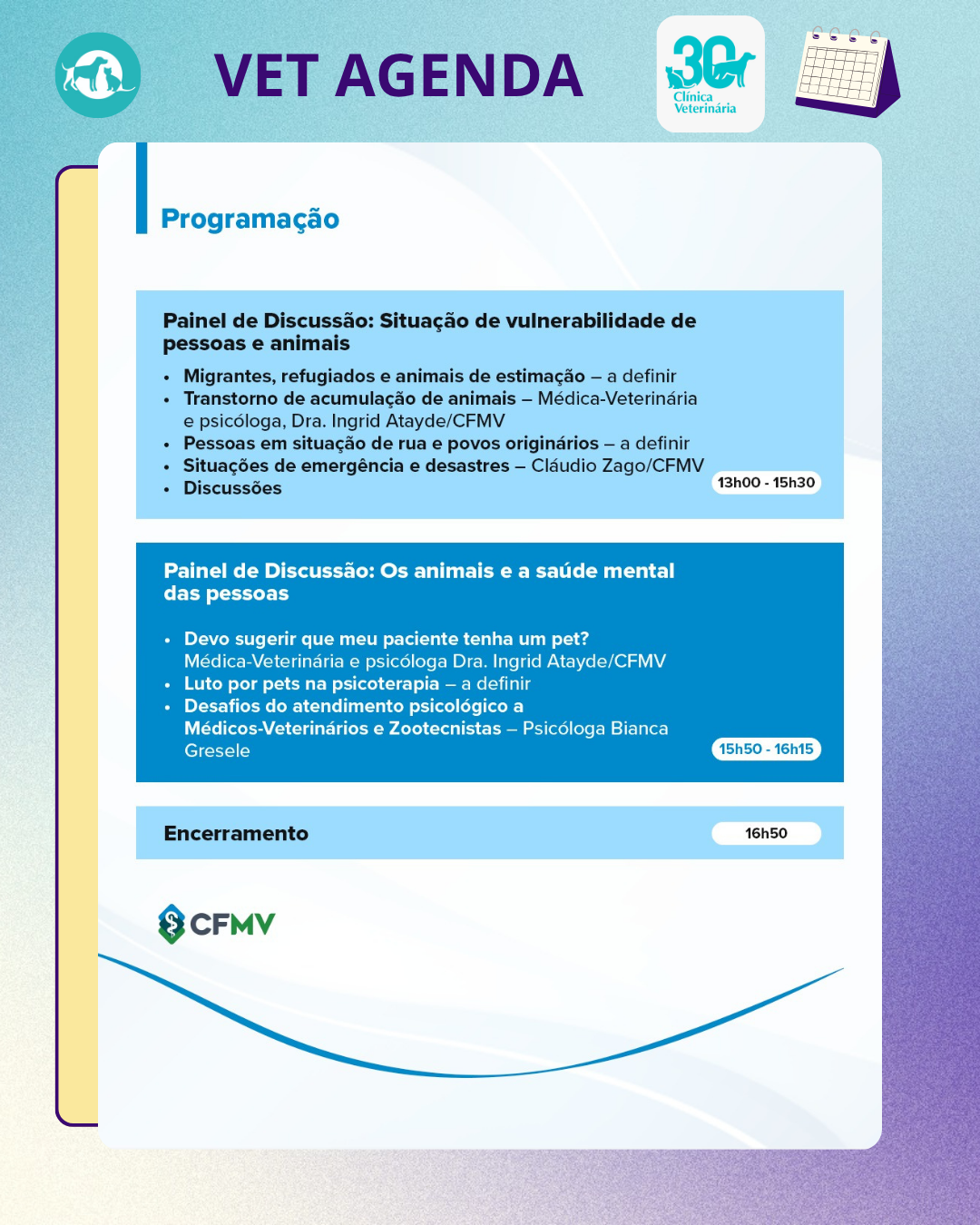 A programação do evento traz temas como animais de apoio emocional e de terapia assistida, transtorno de acumulação, relações com populações em situação de vulnerabilidade, luto por pets e os desafios emocionais enfrentados por médicos-veterinários e zootecnistas.