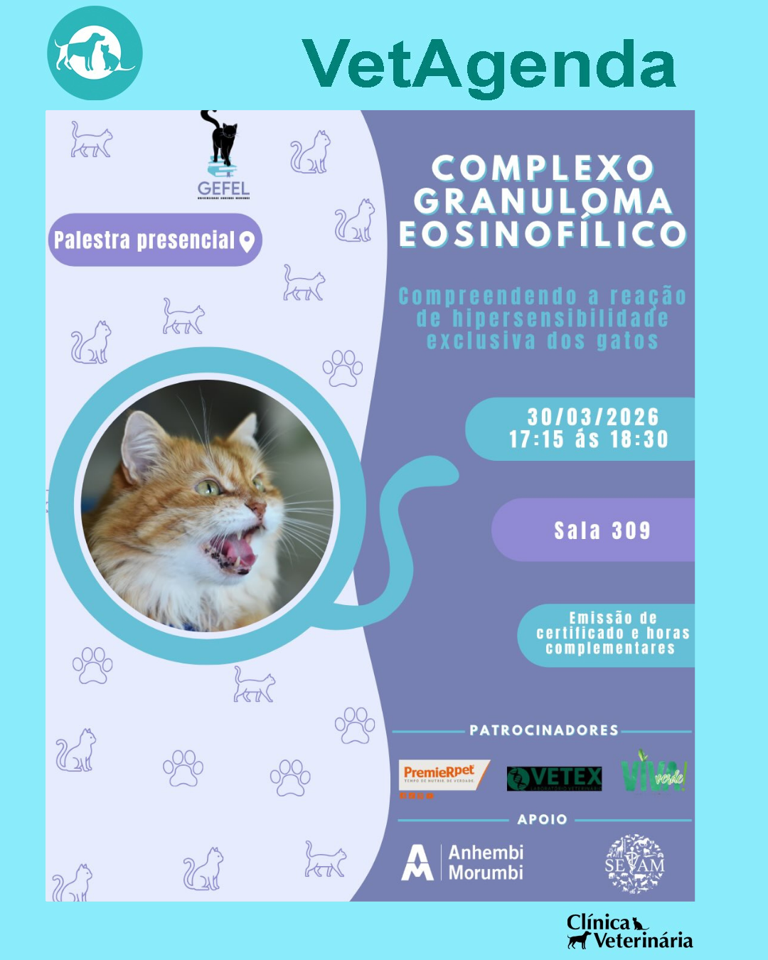 A nossa próxima palestra abordará o tema “Complexo Granuloma Eosinofílico: compreendendo a reação de hipersensibilidade exclusiva dos gatos”. 📝