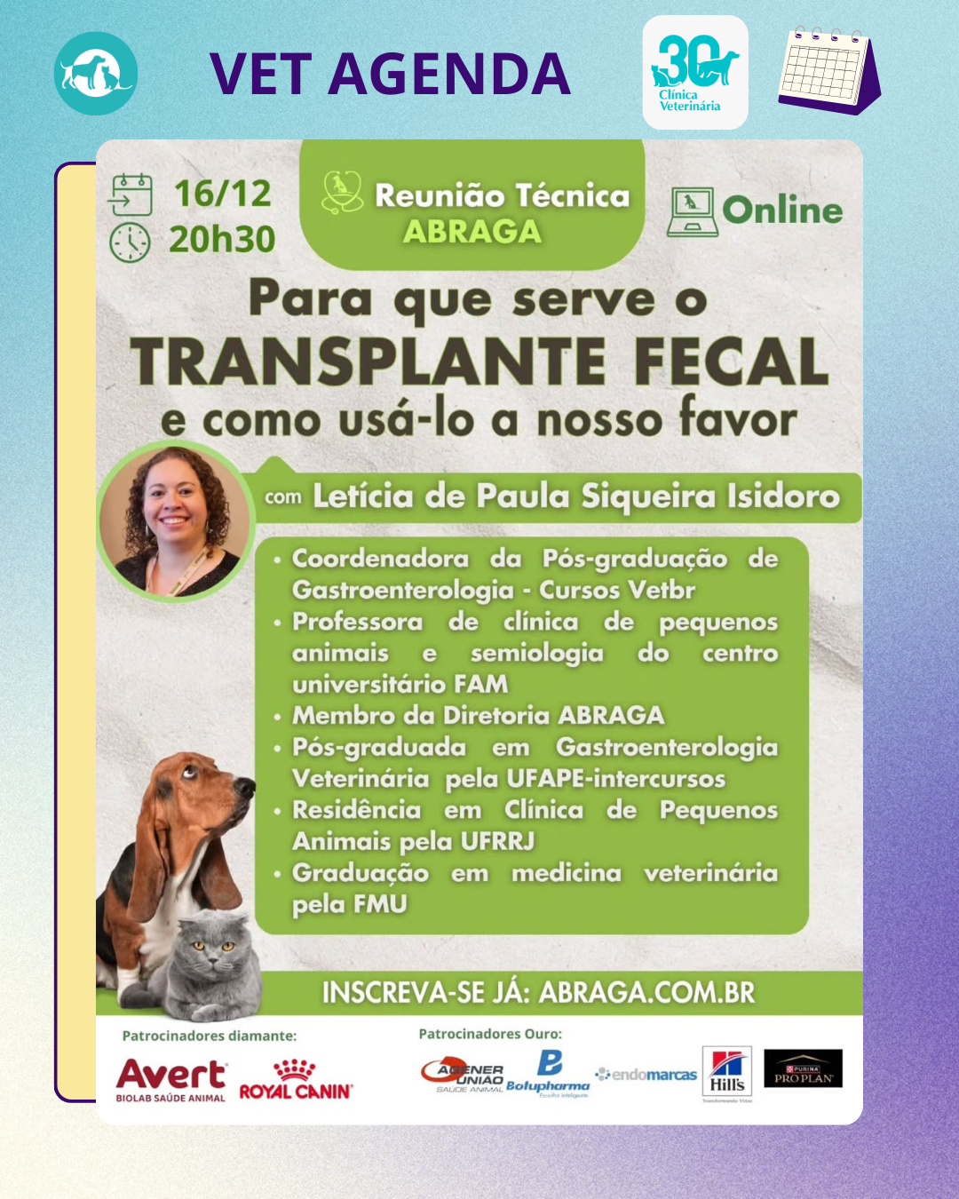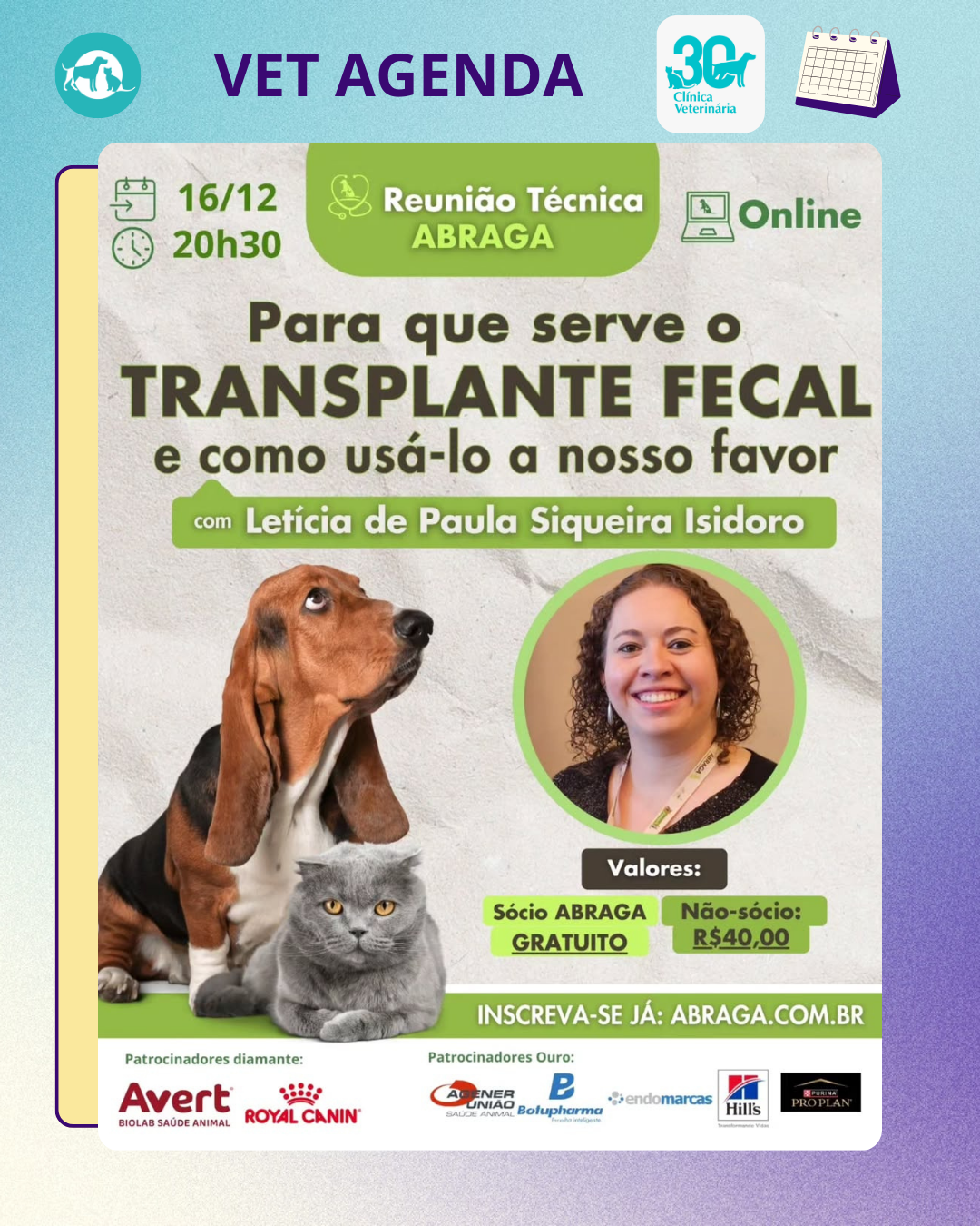 InícioVetAgendaReunião Técnica ABRAGA: Para que serve o Transplante Fecal e como usá-lo a nosso favor