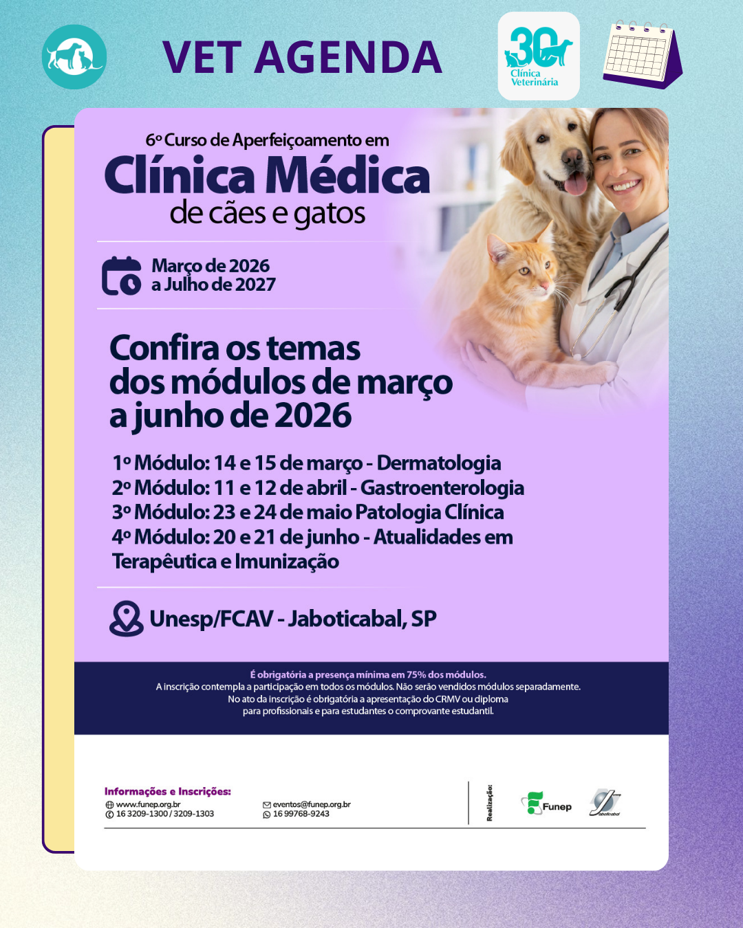 🩺🐶 Participe do 6º Curso de Aperfeiçoamento em Clínica Médica de Cães e Gatos! Atualize seus conhecimentos sobre diagnóstico, manejo e tratamento de doenças em pequenos animais, com conteúdo teórico e prático voltado à rotina clínica. Ideal para quem busca oferecer um atendimento cada vez mais completo e atualizado aos seus pacientes.