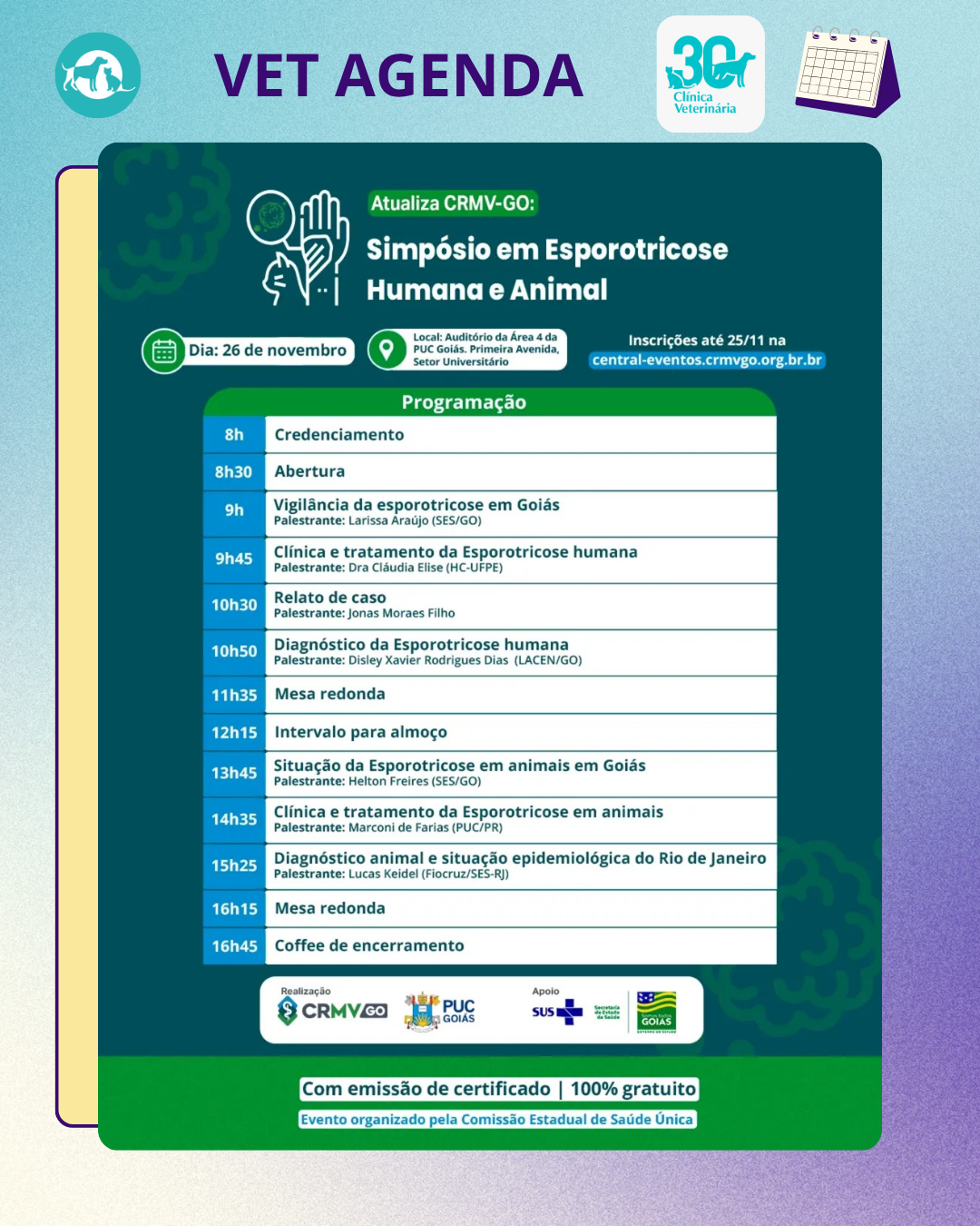 🗓️ No dia 26 de novembro, das 8h às 18h, acontecerá no Auditório da PUC área IV – Praça Universitária, em Goiânia, o evento: Atualiza CRMV-GO: Simpósio de Atualização em Esporotricose Humana e Animal!