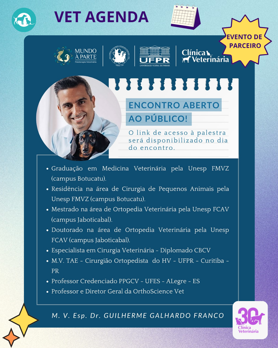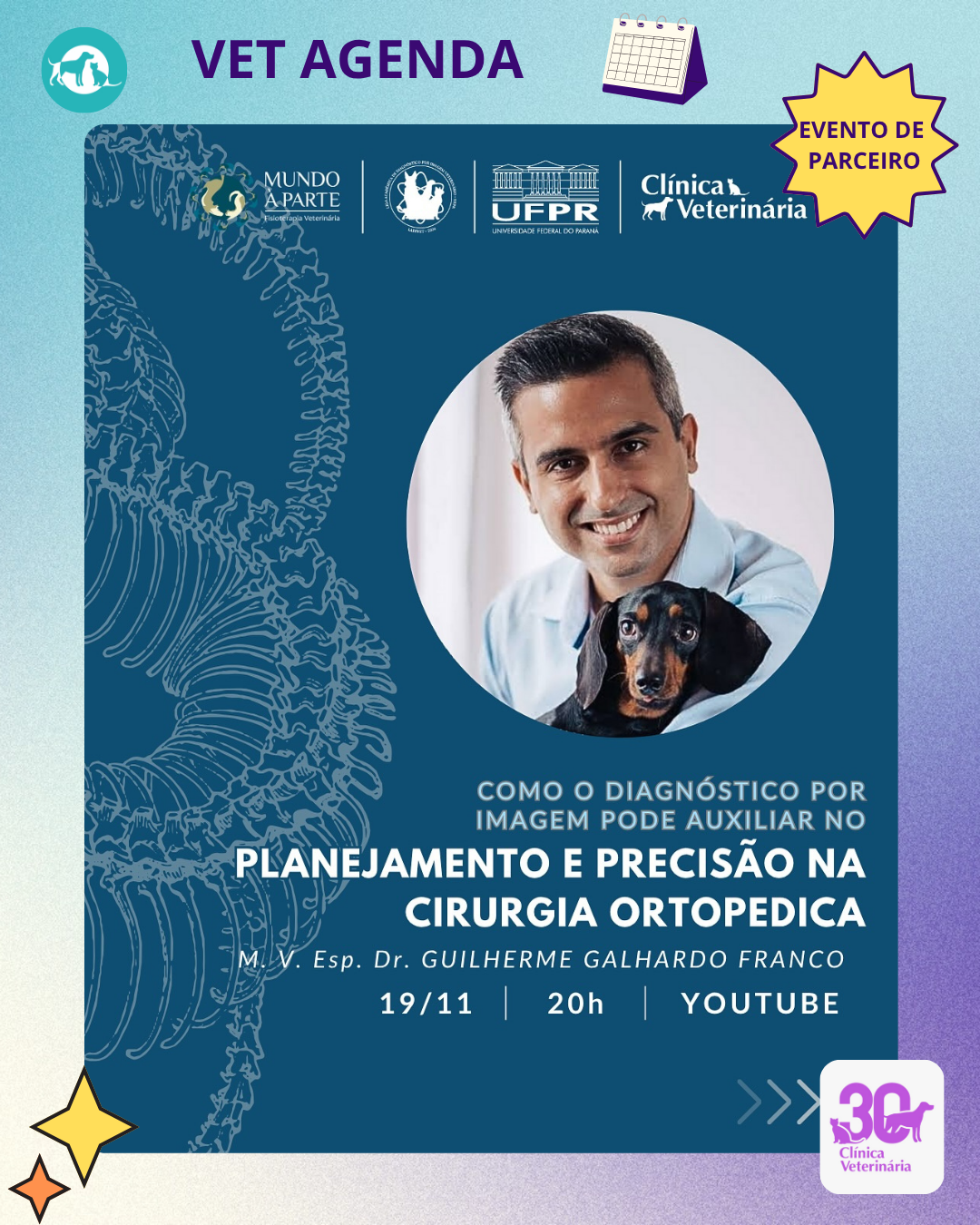 ☢️ Nossa próxima palestra já tem data marcada! Ministrada pelo M.V. Esp. Dr. Guilherme Galhardo Franco, na próxima quarta-feira, dia 19/11, às 20h, a palestra “Como o Diagnóstico Por Imagem pode auxiliar no planejamento e precisão na cirurgia ortopédica” será aberta ao público!