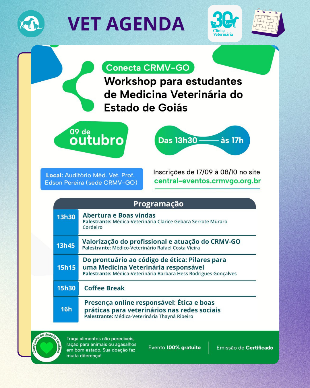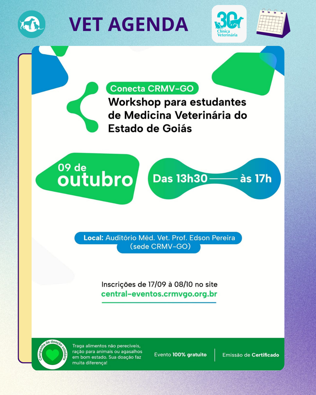 🗓️ No dia 9 de outubro, das 13h30 às 17h, acontecerá no auditório Méd. Vet. Prof. Edson Pereira na sede do Conselho Regional de Medicina Veterinária de Goiás o evento: “Conecta CRMV-GO: workshop para estudantes de medicina veterinária do estado de Goiás”.