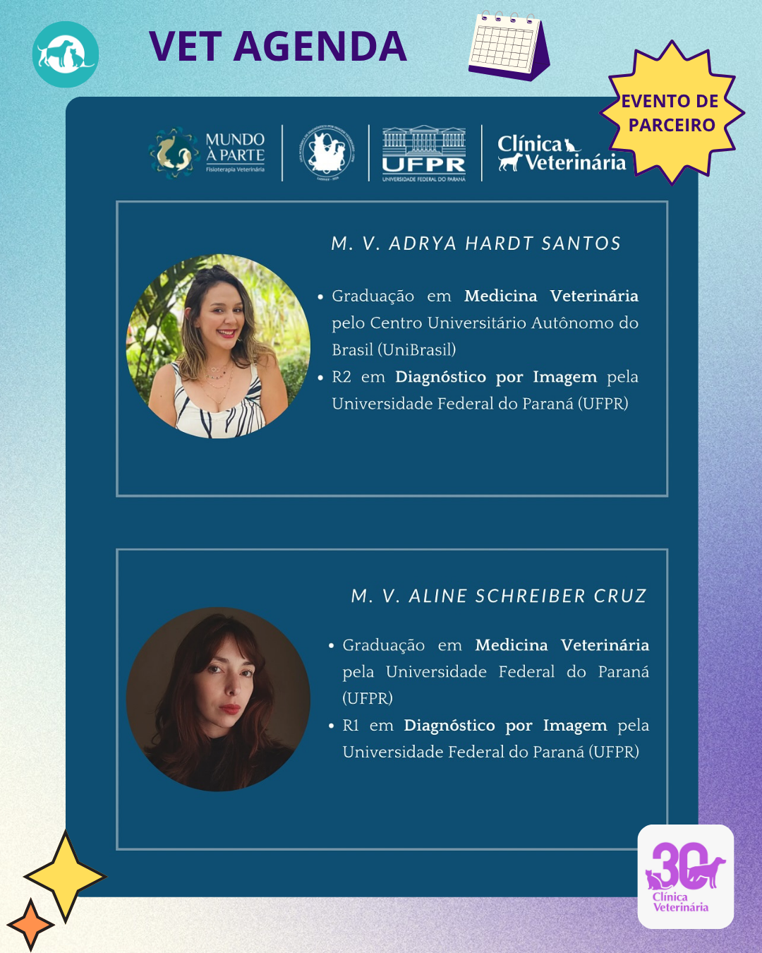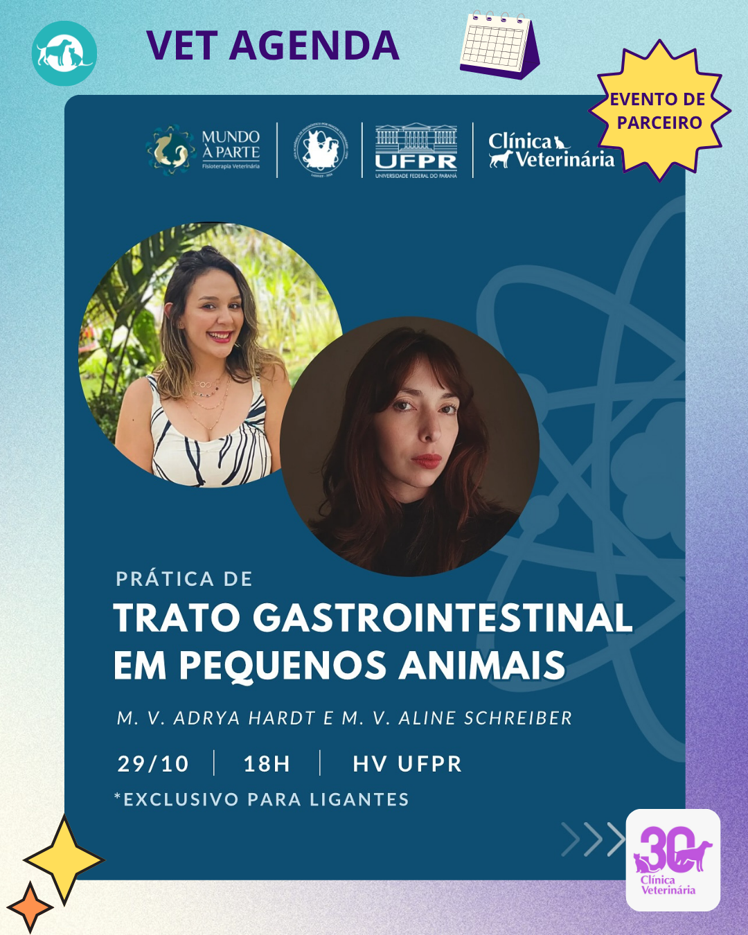 🩺 Próximo encontro prático do semestre! No dia 29/10, as médicas-veterinárias residentes de Diagnóstico por Imagem da UFPR, Adrya Hardt Santos e Aline Schreiber Cruz, ministrarão o encontro “Prática de Ultrassonografia do Trato Gastrointestinal em Pequenos Animais”!