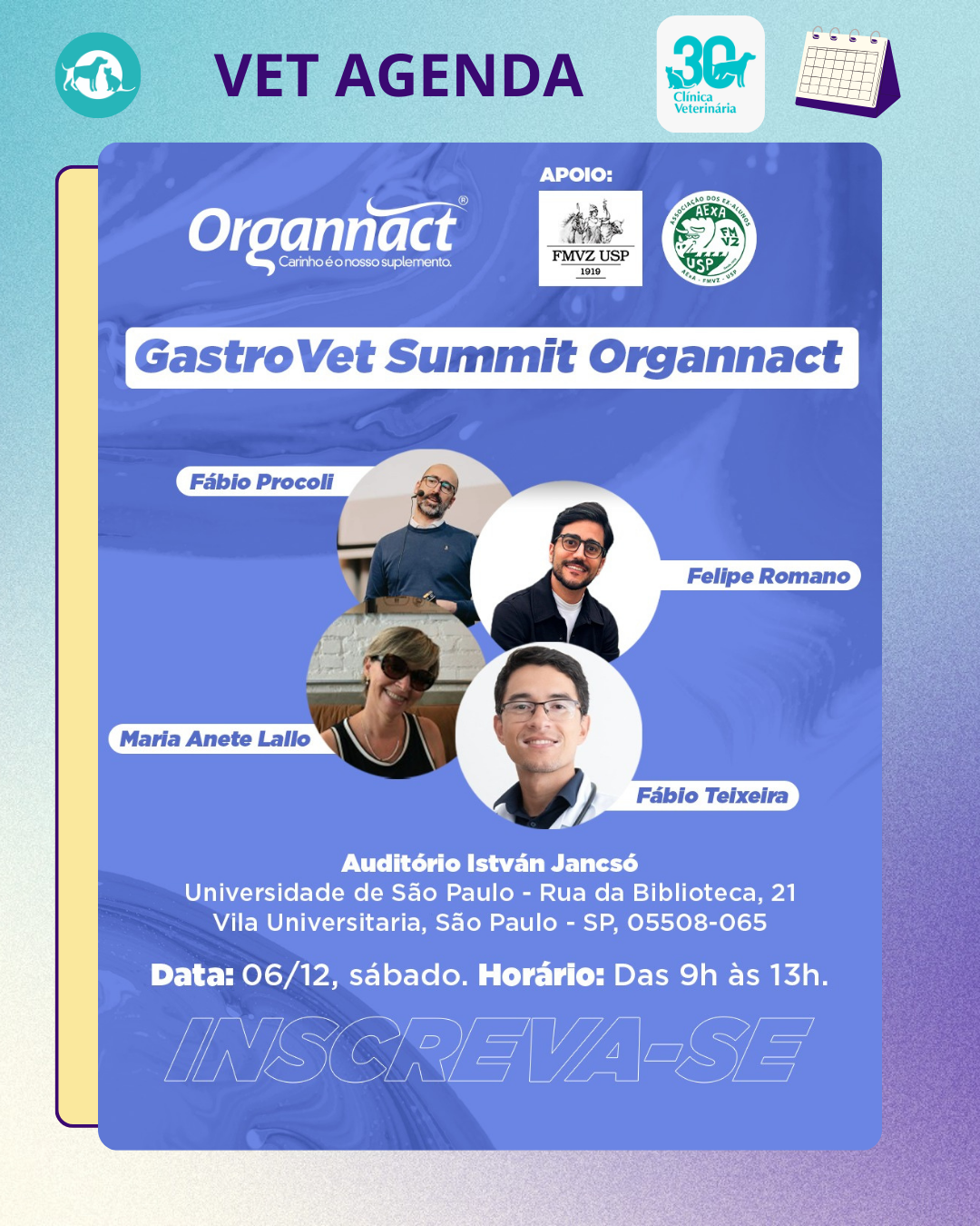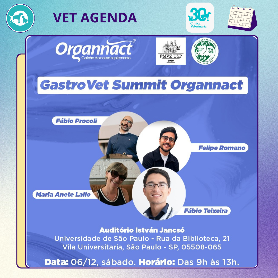 A Organnact, em parceria com a Universidade de São Paulo, vai oferecer um dia repleto de palestras, com muito conteúdo e troca de conhecimentos. O evento vai ser uma excelente oportunidade para se atualizar sobre os mais recentes estudos em gastroenterologia veterinária com pesquisadores e profissionais da área. Inscreva-se!