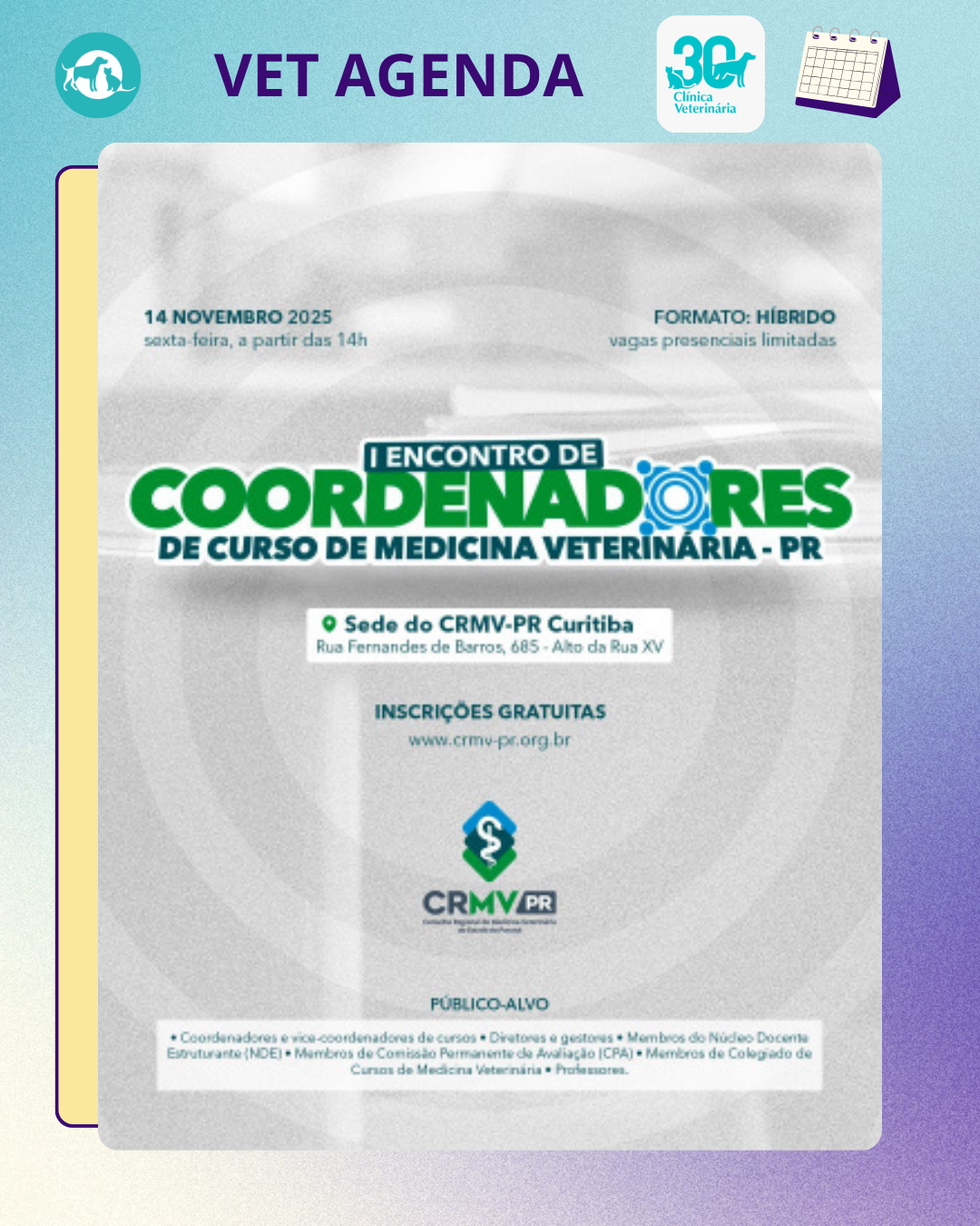 O Conselho Regional de Medicina do Paraná (CRMV-PR), por meio da Comissão Estadual de Educação da Medicina Veterinária, realizará no dia 14 de novembro, das 14h às 18h, o I Encontro de Coordenadores de Curso de Medicina Veterinária no Paraná. O evento ocorrerá na sede do CRMV-PR, em Curitiba, com transmissão ao vivo para os participantes inscritos.