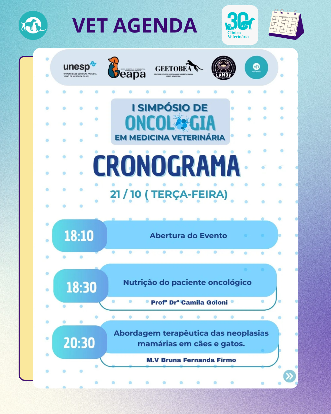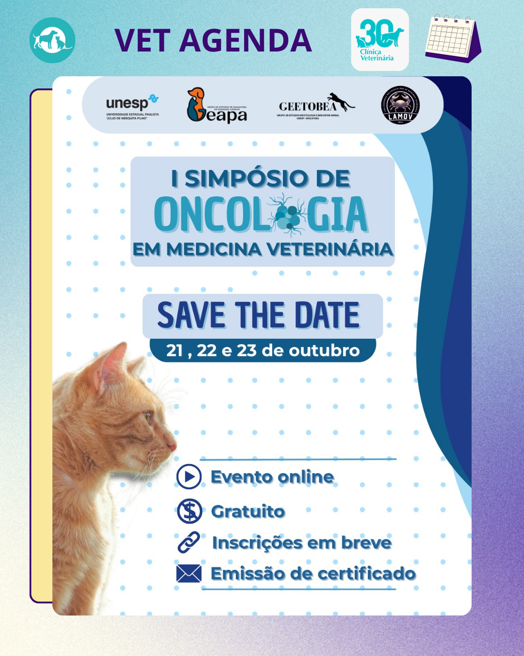 O GEAPA, a LAMOV e o GEETOBEA estão juntos em uma nova colaboração para um simpósio, dessa vez sobre “Oncologia em Medicina Veterinária”. 🐶🐱