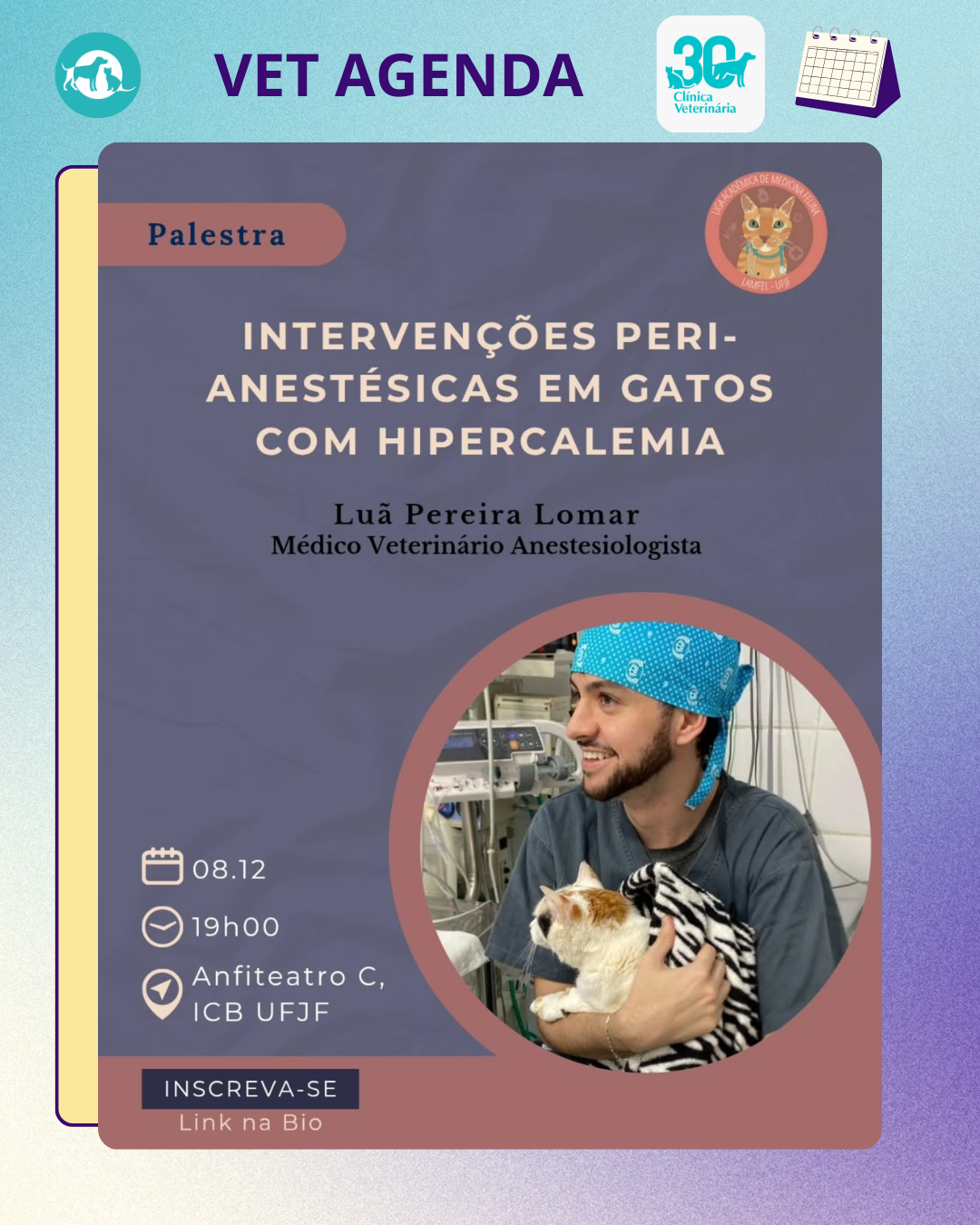 Na próxima segunda-feira (08/12) teremos a palestra do M.V. Luã Lomar sobre “Intervenções Peri-anestesicas em Gatos com Hipercalemia”.
