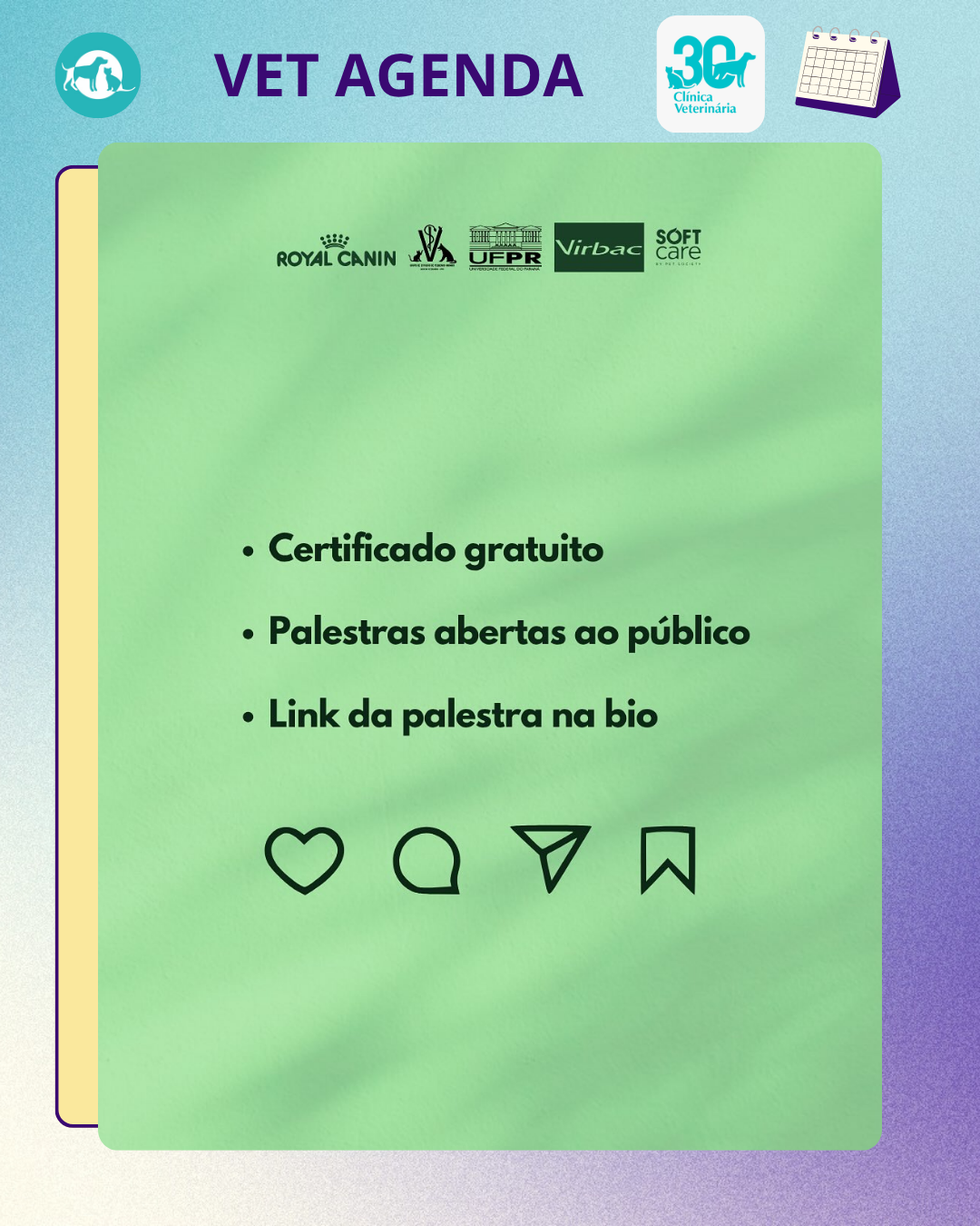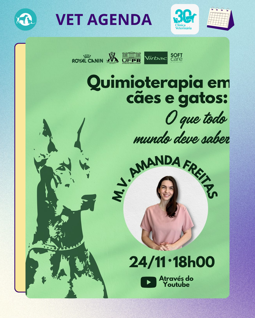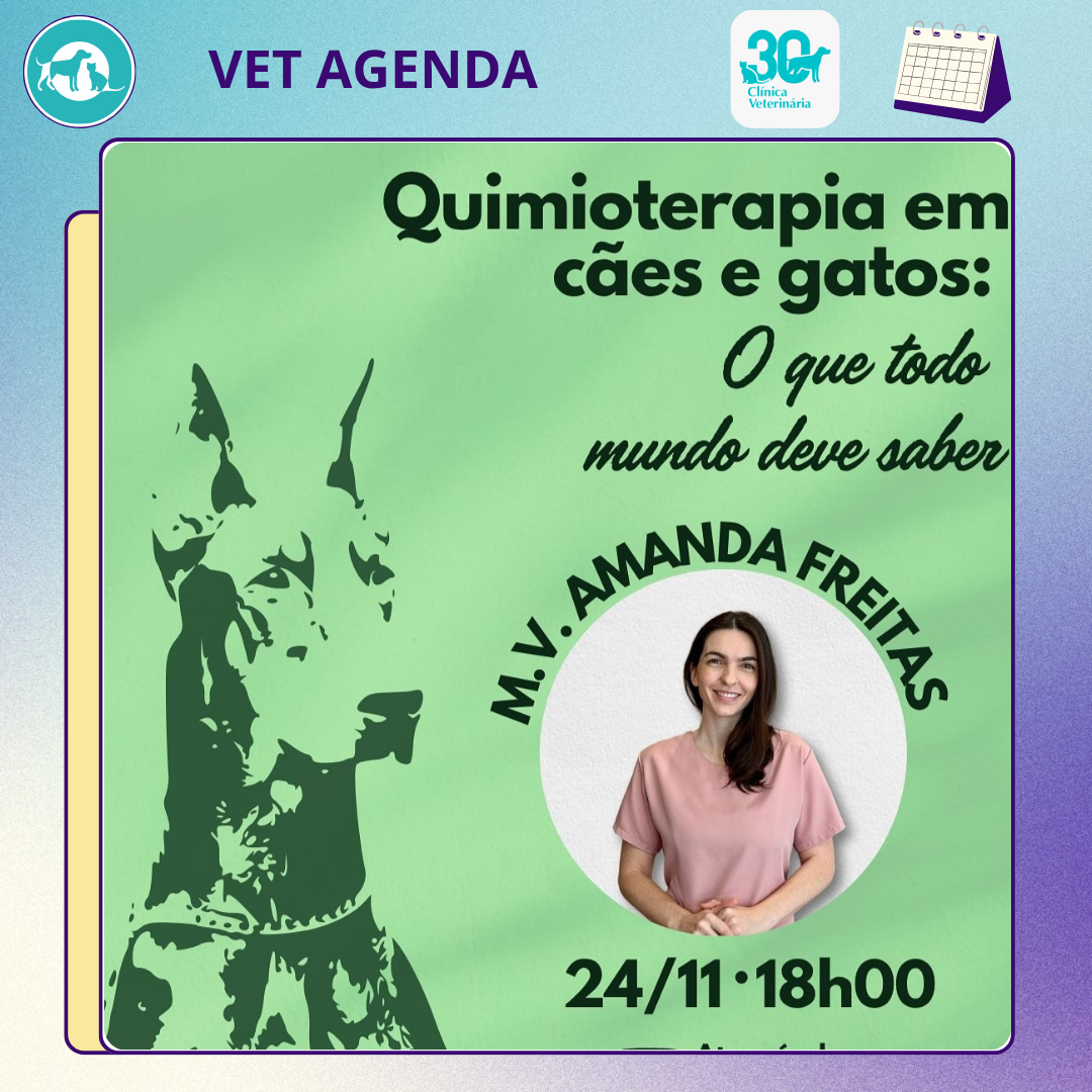 Na próxima segunda-feira, dia 24/11, às 18h30 teremos uma palestra com o tema “Quimioterapia em Cães e Gatos: O Que Todo Mundo Deve Saber” que será ministrada pela M.V. Amanda Freitas! ✨