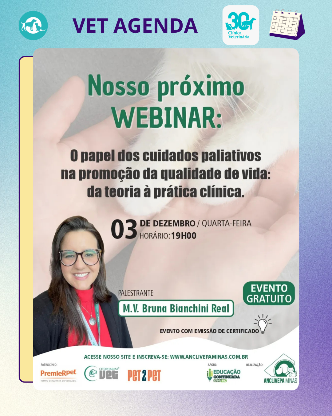 A palestra será conduzida pela M.V. Bruna Bianchini Real, que trará uma abordagem clara, atual e aplicável à rotina veterinária.