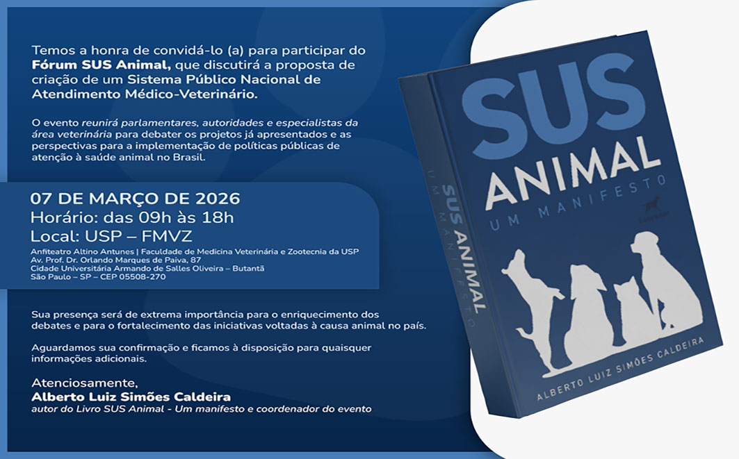 Daremos um passo importante na promoção do diálogo sobre o tema no dia 7 de março de 2026, a partir das 9 horas, com a realização do Fórum SUS Animal, na Faculdade de Medicina Veterinária e Zootecnia da Universidade de São Paulo (FMVZ/USP), em um evento sem fins lucrativos e apartidário. As inscrições, gratuitas, podem ser feitas pelo aplicativo Sympla.