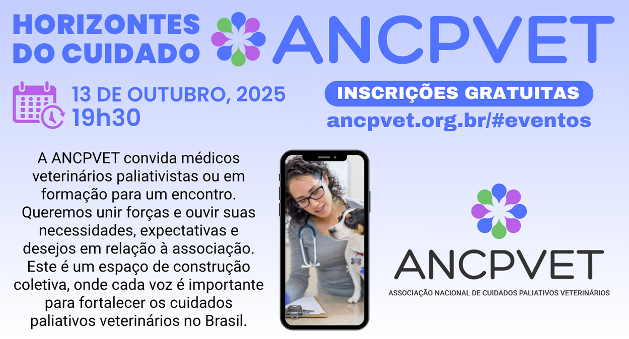 A ANCPVET convida médicos-veterinários paliativistas ou em formação para unir forças e ouvir as necessidades, expectativas e desejos dos profissionais em relação à associação, que é um espaço de construção coletiva, onde cada voz é importante para fortalecer os cuidados paliativos veterinários no Brasil.