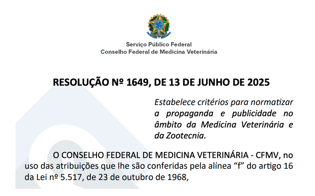 A Resolução nº 1649/2025 (https://manual.cfmv.gov.br/arquivos/resolucao/1649.pdf), do Conselho Federal de Medicina Veterinária (CFMV) entrou em vigor em 17 de outubro de 2025, estabelecendo critérios claros e atualizados para a publicidade e a propaganda profissionais. A norma reforça princípios éticos, reduz práticas abusivas e assegura maior transparência na comunicação com a sociedade.