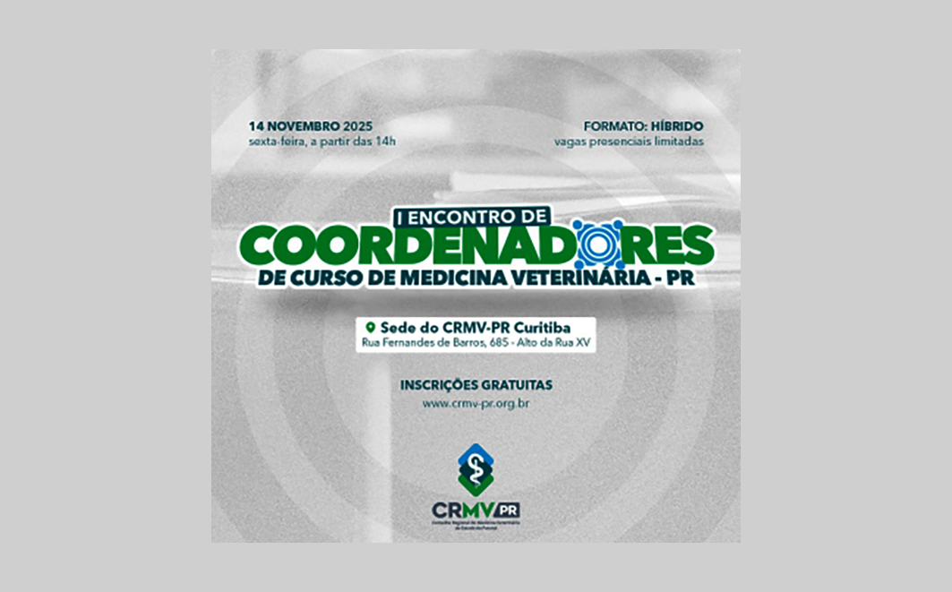 O Conselho Regional de Medicina do Paraná (CRMV-PR), por meio da Comissão Estadual de Educação da Medicina Veterinária, realizará no dia 14 de novembro, das 14h às 18h, o I Encontro de Coordenadores de Curso de Medicina Veterinária no Paraná. O evento ocorrerá na sede do CRMV-PR, em Curitiba, com transmissão ao vivo para os participantes inscritos.