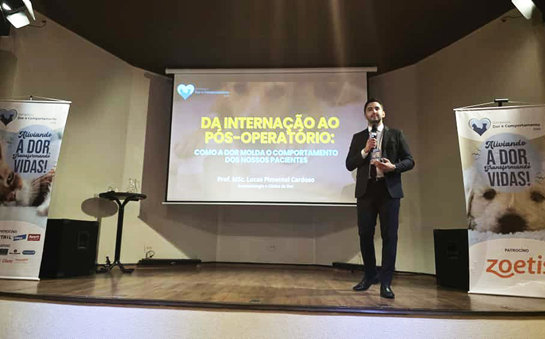 Na sequência, Lucas Pimentel apresentou “Da internação ao pós-operatório: como a dor molda o comportamento dos nossos pacientes”. Ele destacou a importância do controle da dor em todas as etapas do cuidado hospitalar, mostrando como experiências dolorosas podem deixar marcas emocionais duradouras e alterar o comportamento futuro do animal.