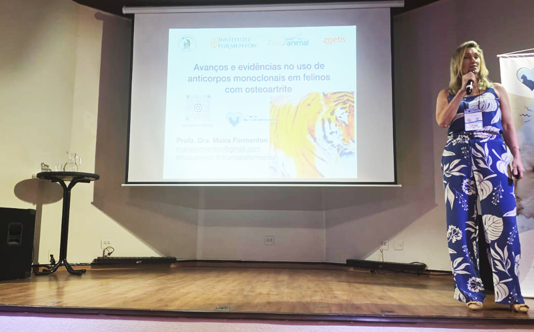 Na sequência, Maira Formenton apresentou “Anticorpos monoclonais na OA felina: da pesquisa à prática clínica”, trazendo uma visão atualizada sobre as novas terapias disponíveis para o tratamento da osteoartrite em gatos. Sua palestra mostrou como os anticorpos monoclonais estão revolucionando o controle da dor felina, oferecendo segurança e eficácia em um grupo de pacientes historicamente desafiador.