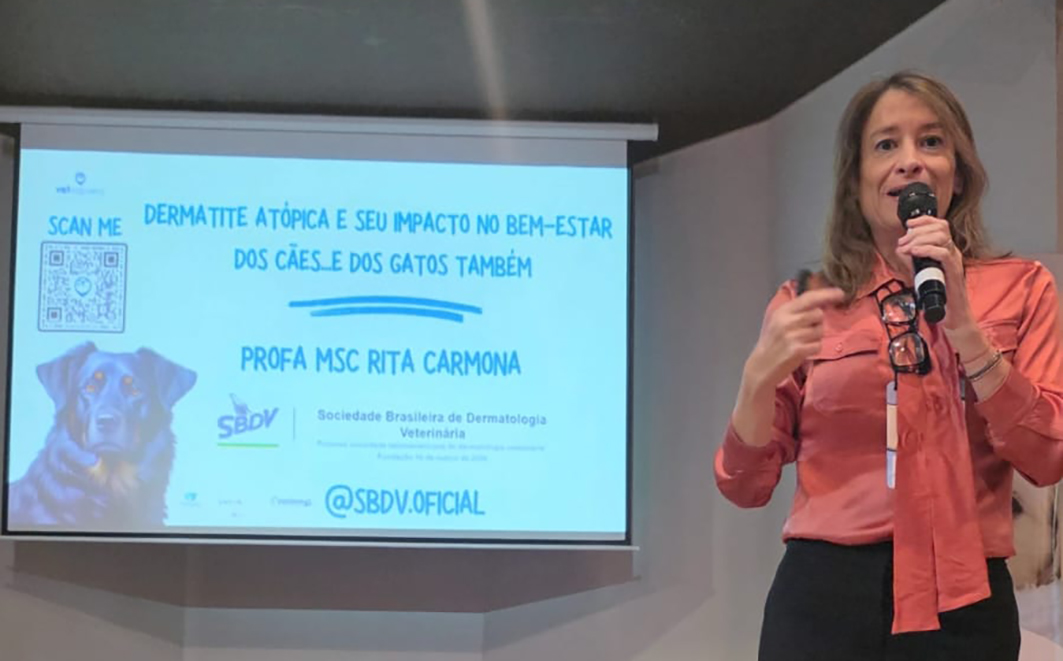 Em seguida, Rita Carmona apresentou “Dermatite atópica e seu impacto no bem-estar dos cães”, destacando que doenças dermatológicas não afetam apenas a pele, mas todo o comportamento e a qualidade de vida do animal. Rita mostrou como o prurido constante e a inflamação crônica podem gerar irritabilidade, alterações de sono e até mudanças nas interações sociais.