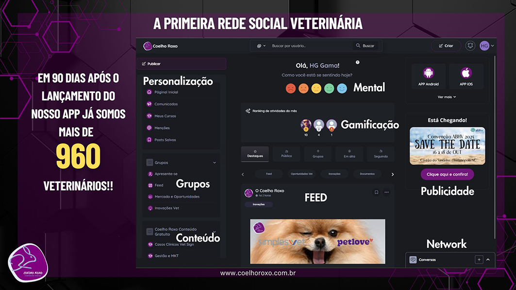 Com debates pertinentes, cursos práticos e um ambiente seguro para compartilhar ideias técnicas e desafios do dia a dia, a Coelho Roxo se destaca como uma ponte entre o presente e o futuro da medicina veterinária e da gestão pet.