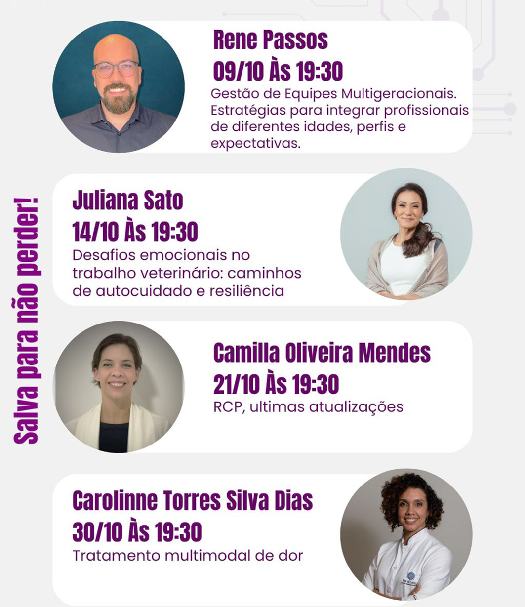 Ao longo de 17 episódios apresentados até o momento, a série de webinars tem trazido conteúdos diversificados, voltados tanto para o aprimoramento técnico em diversas especialidades veterinárias quanto para o desenvolvimento de habilidades em gestão e administração – áreas cada vez mais essenciais para o sucesso do profissional moderno.