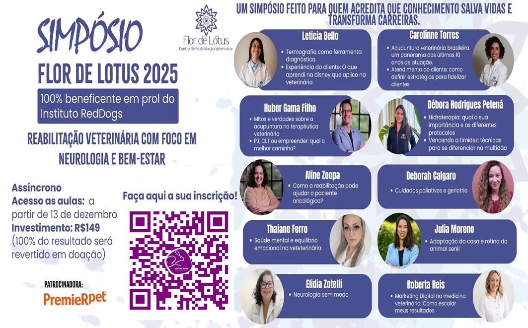 A plataforma Coelho Roxo, em parceria com o Centro de Reabilitação Veterinária Flor de Lótus, anuncia a realização de um evento online grandioso: o Simpósio Beneficente Flor de Lótus, que promete unir capacitação de alta qualidade, conhecimento técnico e a oportunidade de fazer a diferença em prol dos animais. Todo o resultado das vendas do simpósio será revertido para o Instituto RedDogs, que há anos atua na formação de cães de assistência.