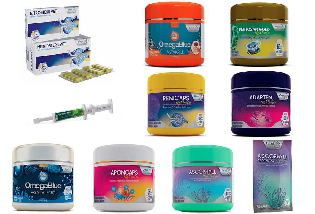 O portfólio da OmniLab é estruturado em duas linhas estratégicas: High End Line, composta por Ascophyll, Ascophyll Croquetas, Aponcaps, Gastroband, Pentosan, Nitrosteril Vet, Adaptem e Renicaps; e a linha Omegablue, com Esqualeno e Astakrill.