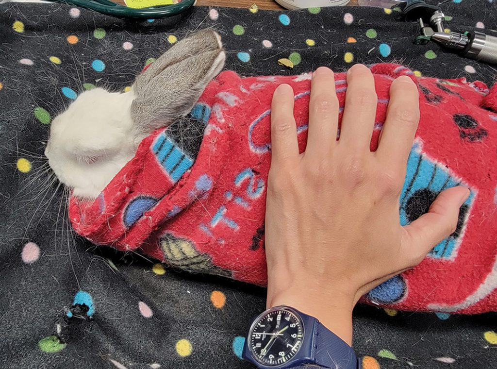 Os coelhos devem ser examinados em superfícies cobertas por materiais antiderrapantes, como toalhas, mantas, fleece ou tapetes emborrachados, uma vez que esses tipos de apoio evitam escorregões. Caso estejam exibindo altos níveis de estresse e resistindo a ser pegos do chão, aconselha-se envolvê-los em uma toalha, cobrindo o campo visual com ela ou com uma das mãos. Os coelhos que resistem podem pular e sofrer traumas na coluna ou em outros ossos. A técnica do “rolo de coelho” ou “burrito de coelho” (Bunny burrito, em inglês) consiste em colocar o animal sobre uma toalha e envolvê-lo pelos dois lados, como se estivesse montando um burrito. Mais informações sobre a técnica estão a seguir, na seção “Atendimento: manuseio, contenção e exame clínico”. Apesar de serem adequadamente contidos com essa técnica, os coelhos podem contrair os músculos e se traumatizar 19.