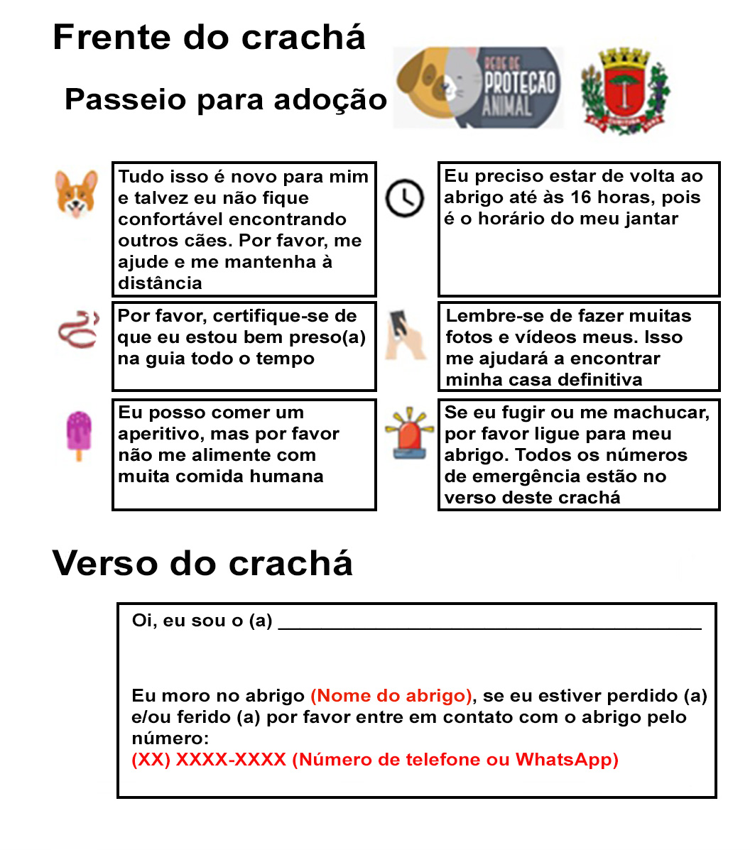 Para dar mais segurança aos cães participantes do PA, eles devem usar um crachá de identificação com várias informações importantes, como, “por favor se certifique de que estou preso na guia o tempo todo”, “lembre-se de fazer muitas fotos e vídeos, pois isso pode me ajudar a encontrar meu lar definitivo”, e no verso do crachá deve constar o nome do cão e o contato do abrigo, caso aconteça algum problema durante o passeio (Figura 2).